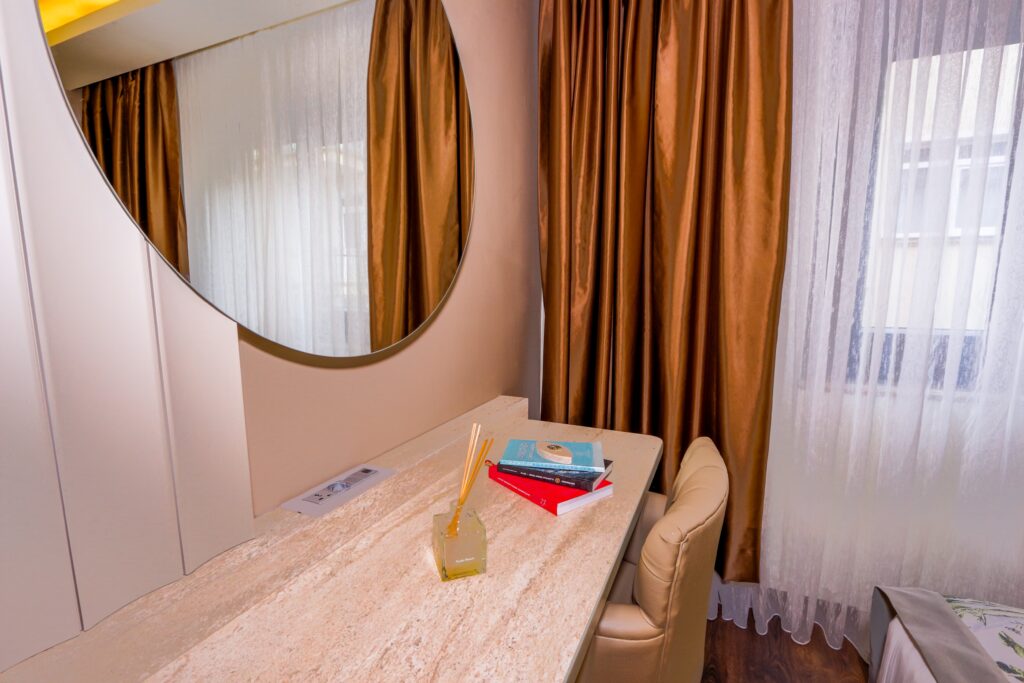 Banyo alanında ise duş, saç kurutma makinesi, hijyen kiti ve telefon gibi detaylar bulunmaktadır. Odalarımız halı zeminlidir ve balkonsuzdur, ancak sunduğumuz konfor ve hizmet kalitesiyle misafirlerimizin ihtiyaçlarını en iyi şekilde karşılamak için her detay düşünülmüştür.